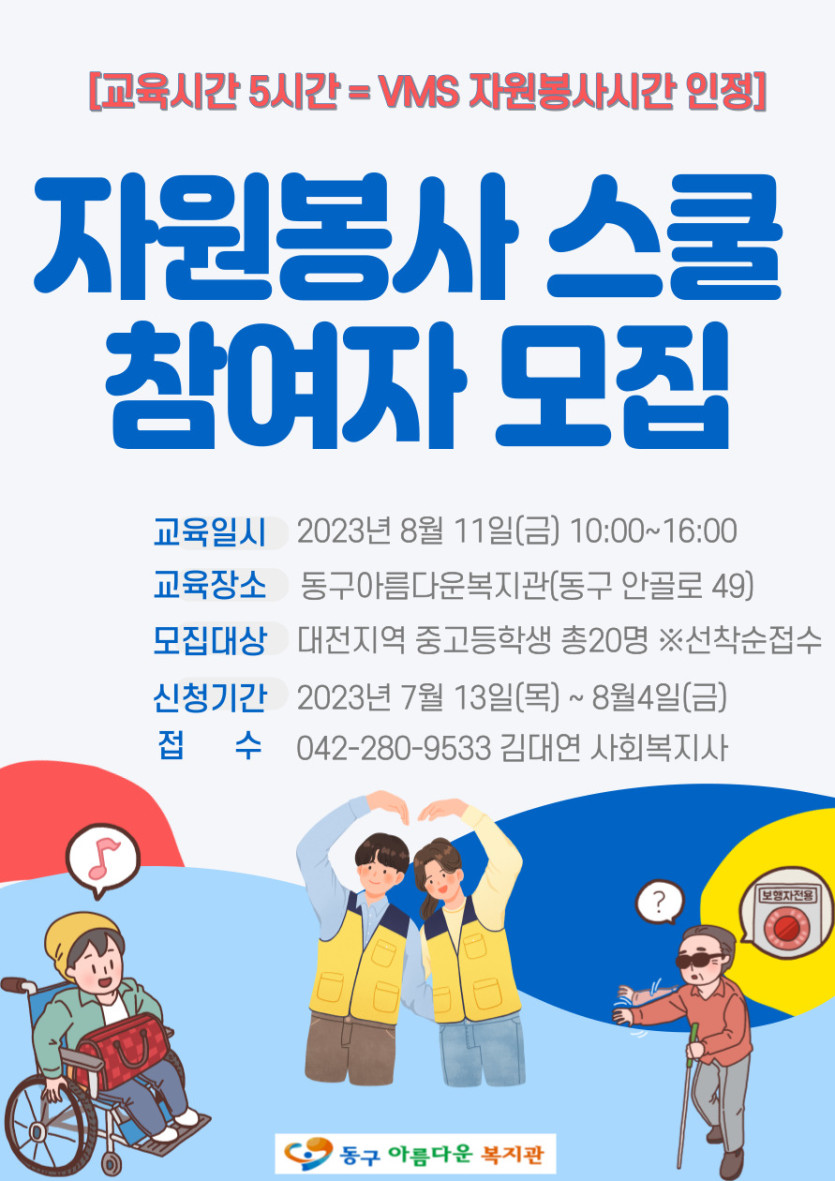 [자원봉사 스쿨] 참여자 모집 페이지 정보 작성자 관리자 댓글 0건 조회 7,428회 작성일 23-07-19 17:21 본문 ※ 교육시간 5시간 = VMS자원봉사시간 인정※ 점심식사 제공 목록 이전글『같이 봄, 가치 봄』 이쉼전쉼 체험 2차 참여 안내 23.07.26 다음글2023년 하계 계절학교 참가자 추첨결과 23.07.18 댓글목록 댓글목록 등록된 댓글이 없습니다.
