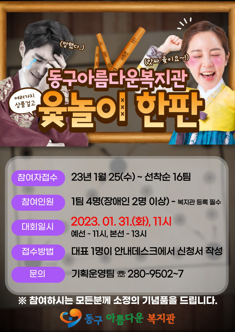 2023년 정월대보름 척서대회 참여자 모집 안내 페이지 정보 작성자 관리자 댓글 0건 조회 7,661회 작성일 23-01-25 09:20 본문 2023년 정월대보름 척서대회 참여자 모집 안내 목록 이전글동구아름다운복지관(민관협력) 채용 1차 서류전형 합격자 공고 23.01.27 다음글(접수기간 연장) 동구아름다운복지관 사회복지사(민관협력) 채용 공고 23.01.18 댓글목록 댓글목록 등록된 댓글이 없습니다.