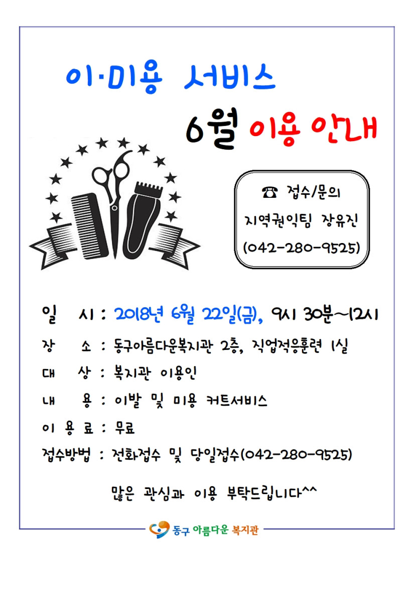 6월 이미용서비스 이용안내 작성일 18-06-01 14:12 페이지 정보 작성자지역권익팀 장유진 조회 10,026회 댓글 0건 본문 6월 22일(금) 9시30분~12시까지 이미용서비스를 진행합니다.많은 관심과 이용 부탁드립니다. 이전글 다음글 목록 댓글목록 댓글목록 등록된 댓글이 없습니다.
