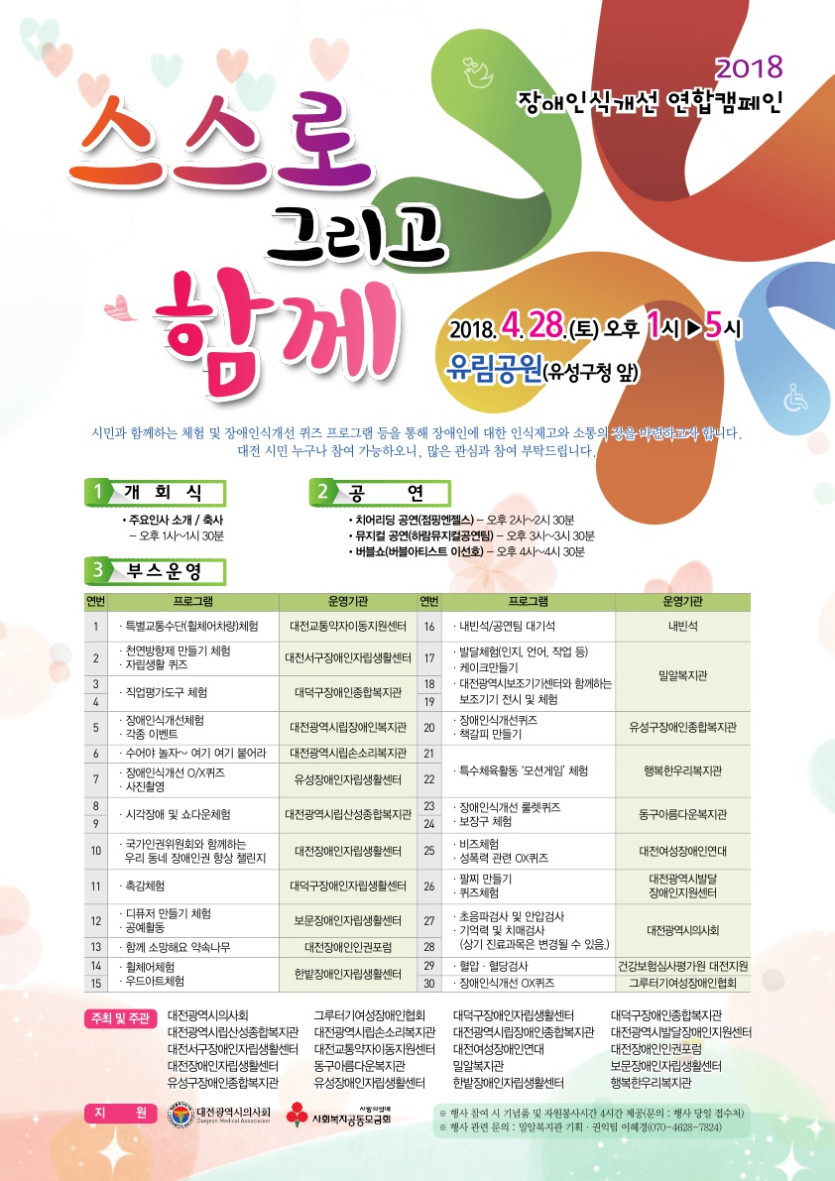 4월 28일(토) 오후 1시~5시 유림공원 다목적 잔디광장에서 장애인식개선 연합캠페인을 실시합니다.