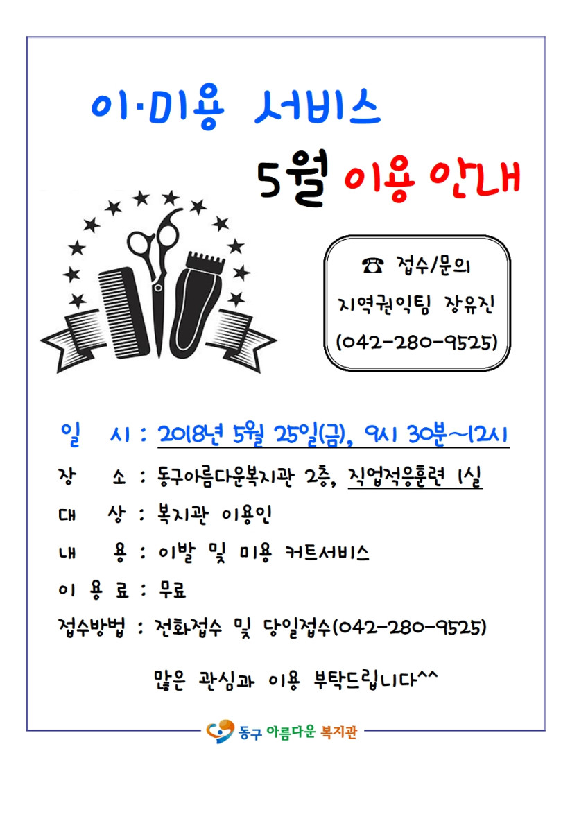 5월 이미용서비스 이용안내 페이지 정보 작성자 지역권익팀 장유진 댓글 0건 조회 10,749회 작성일 18-05-09 11:35 본문 5월 25일(금) 9시 30분부터 12시까지 이미용서비스를 진행합니다.많은 이용 부탁드립니다^^ 목록 이전글2018년도 복지관 모니터요원 모집 18.05.14 다음글5월 보장구 점검 및 수리/세척 서비스 일정 안내 18.05.04 댓글목록 댓글목록 등록된 댓글이 없습니다.
