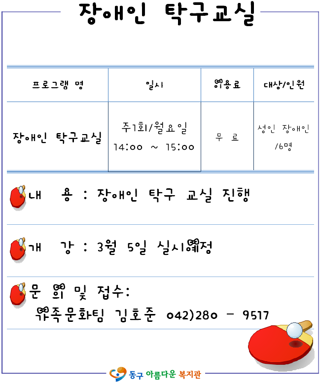 장애인 탁구교실 이용자 모집 페이지 정보 작성자 가족문화팀 김호준 댓글 0건 조회 10,241회 작성일 18-02-07 14:02 본문 3월부터 장애인 탁구교실이 진행되오니 많은 분들 참여해주시면 감사하겠습니다. 목록 이전글이미용 컷트교육 이용인 모집안내 18.02.12 다음글2017년 2차 추경 예산 공지 17.12.22 댓글목록 댓글목록 등록된 댓글이 없습니다.