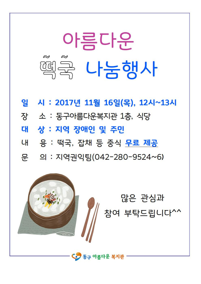 11월 16일(목) 아름다운 떡국 나눔행사 실시 페이지 정보 작성자 장유진 댓글 0건 조회 9,396회 작성일 17-11-02 13:31 본문 떡국 나눔행사를 실시하오니,많은 참여 부탁드립니다^^ 목록 이전글특수체육 이용자를 모집합니다. 17.11.03 다음글11월 24일(금) 이미용서비스 실시 안내 17.11.01 댓글목록 댓글목록 등록된 댓글이 없습니다.