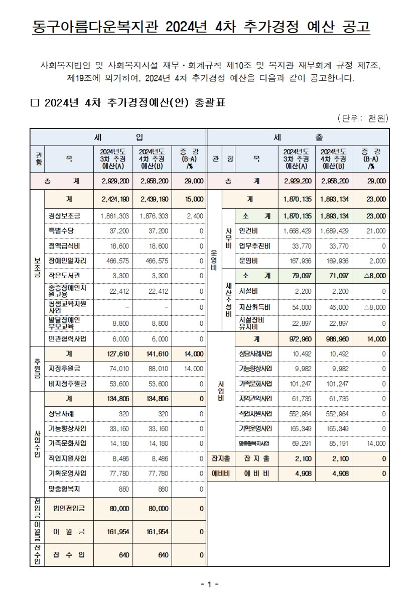 동구아름다운복지관 2024년 4차 추경예산 공고